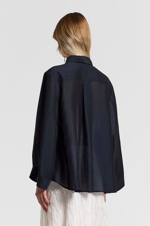 Легкая и изысканная рубашка из органзы играет со светом и прозрачностью. Расклешенный крой подчеркивает силуэт, а длинные широкие рукава создают деликатную игру объемов.