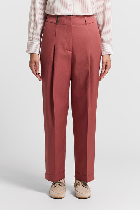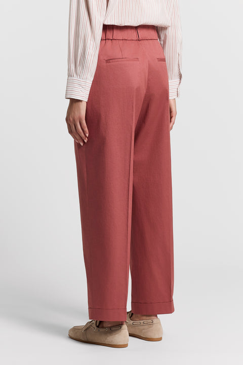 Эти брюки олицетворяют собой весну и лето. Они сшиты из легкого хлопка и имеют свободный силуэт благодаря эластичному поясу сзади и вытачкам.