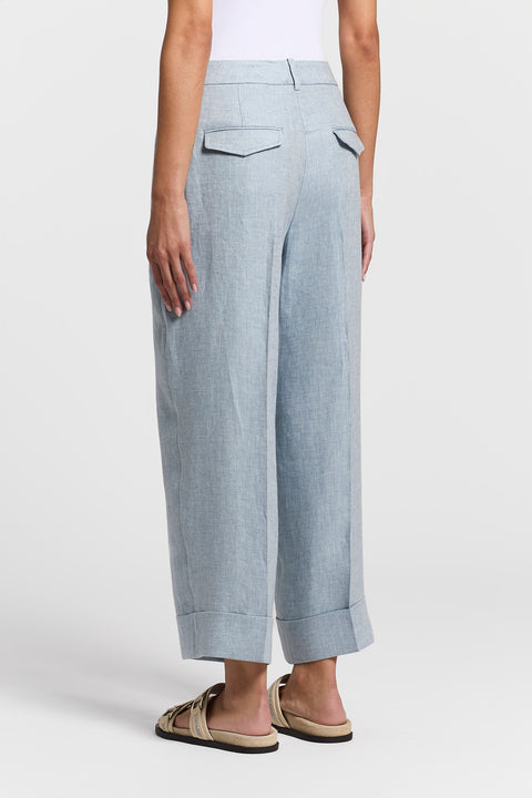 Эти укороченные брюки с широкими штанинами из чистого льняного габардина, окрашенного в массе, сочетают в себе структурность и легкость.