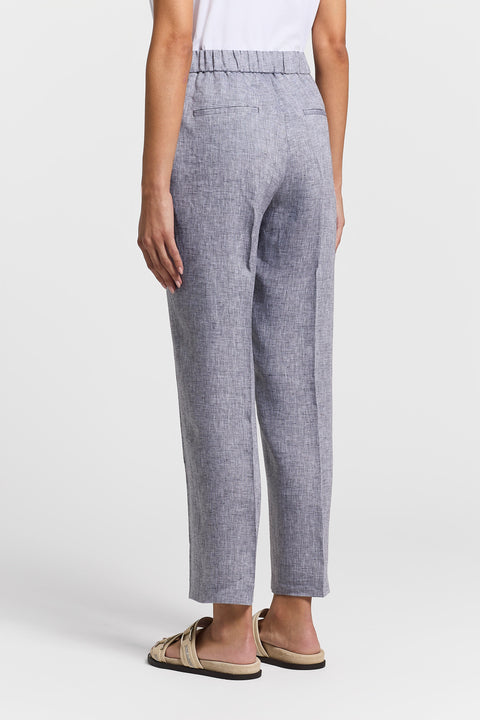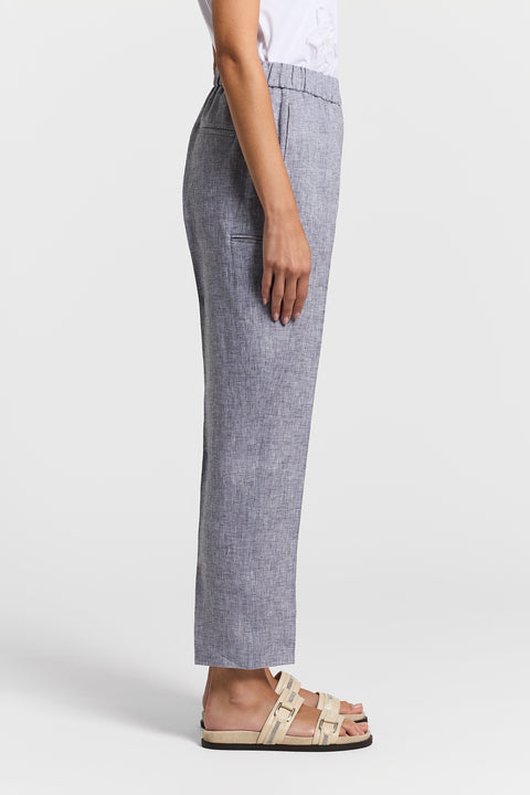 Эти брюки 4718, незаменимая вещь в гардеробе любой женщины, изготовлены из легкого льна — натурального волокна, которое гарантирует свежесть, воздухопроницаемость и комфорт, что делает их идеальным вариантом для теплого времени года.