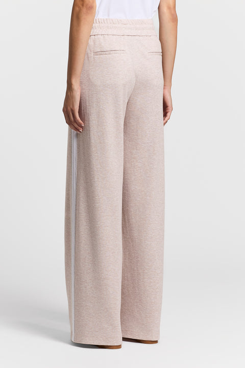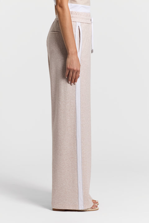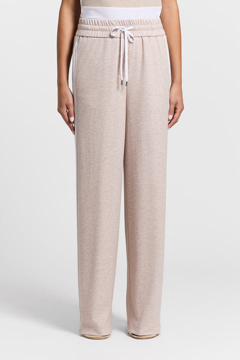 Слегка завышенная талия, дополненная резинкой и кулиской, подчеркивает фигуру, а контрастная лента по бокам задает тон модели.