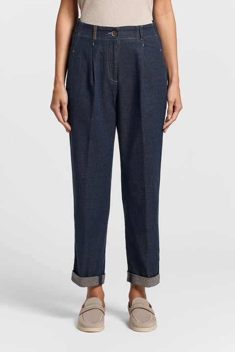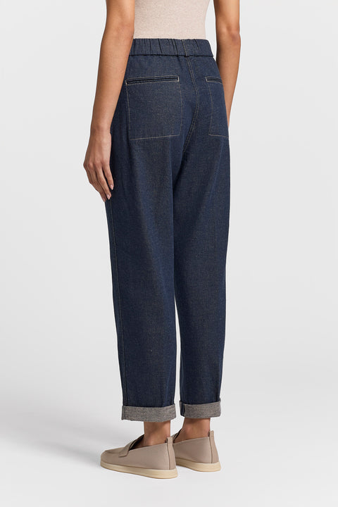 Эти брюки с пятью карманами сшиты из ткани, которая представляет собой изысканную альтернативу традиционному дениму: саржевая ткань из эластичного хлопка и льна, сочетающая в себе аутентичную эстетику джинсов и непревзойденный комфорт.