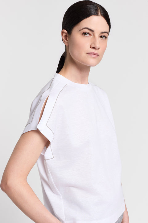 Короткие рукава-кимоно заканчиваются разрезом, который украшен деталью Punto Luce, повторяющей отделку плеча.
