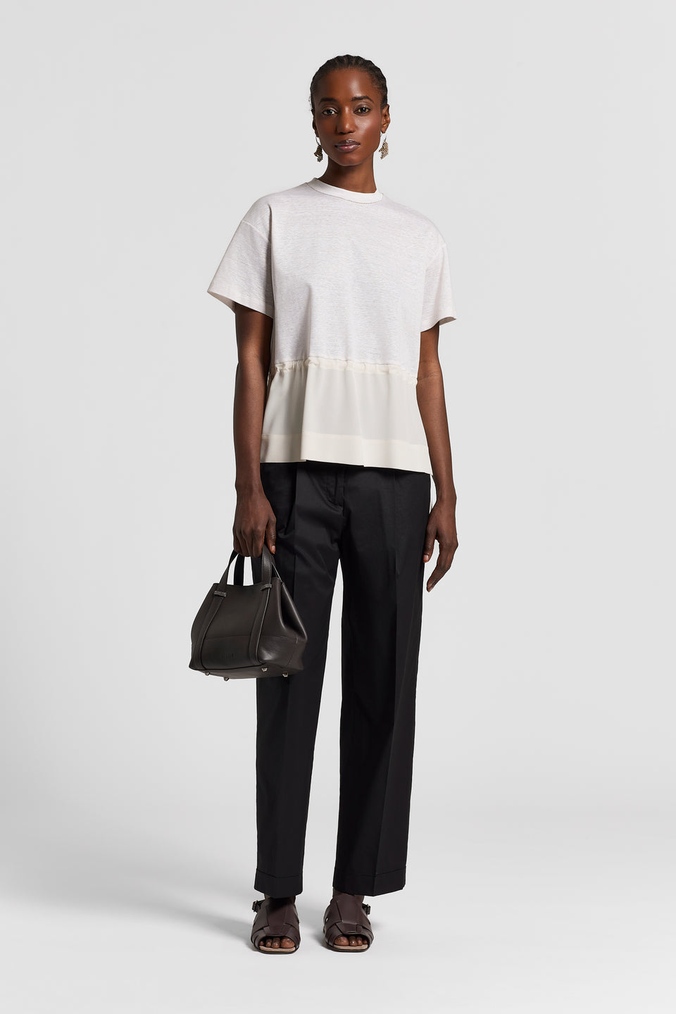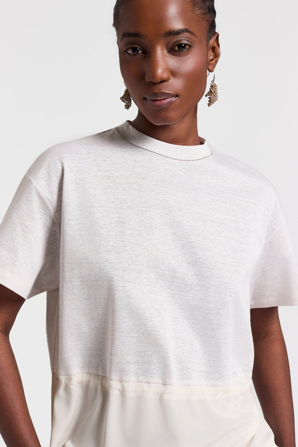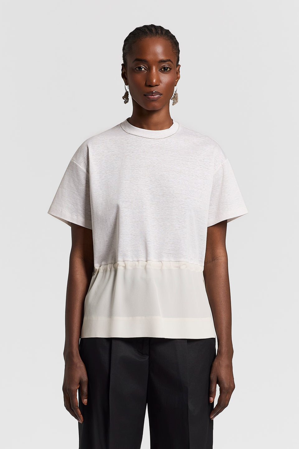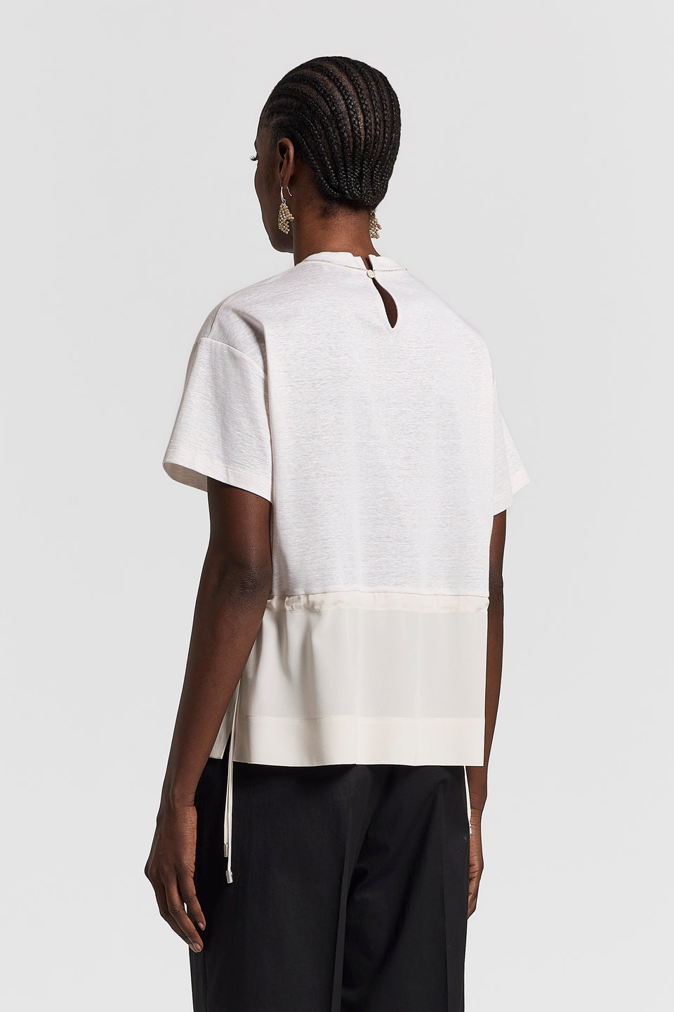 Свежесть льна сочетается с мягкостью хлопка в верхней части этой футболки, дополненной кружевным поясом на талии, который отделяет нижнюю часть из шелкового крепдешина.