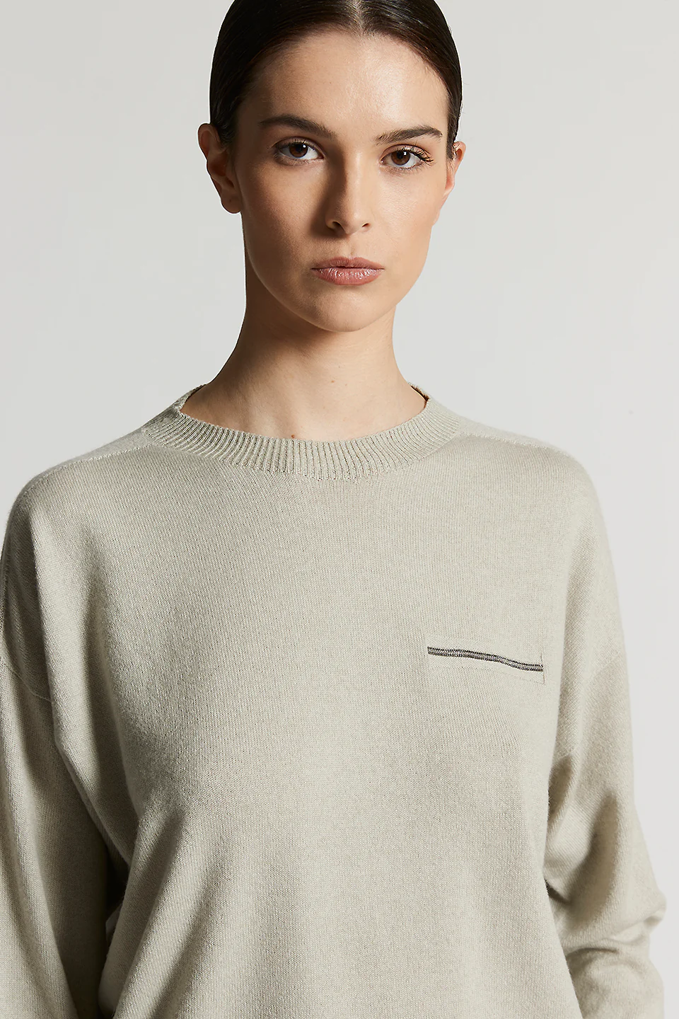 Горловина и отделка в рубчик украшены люрексом, который придает изделию мерцание. Наша культовая деталь Punto Luce обновлена в этих изделиях из чистого кашемира с термосварным швом.