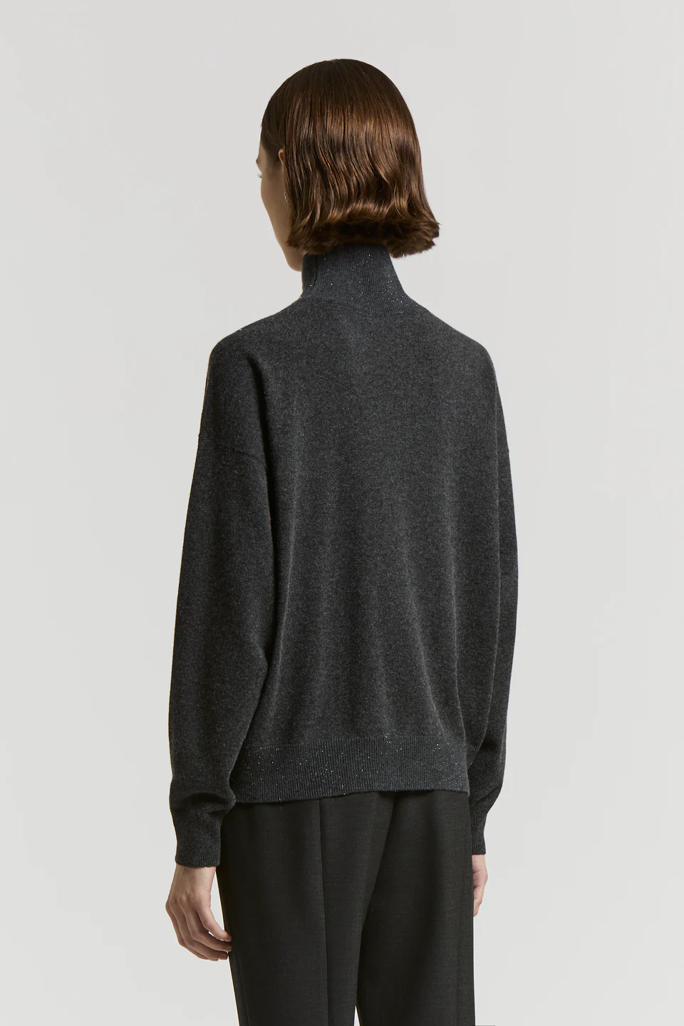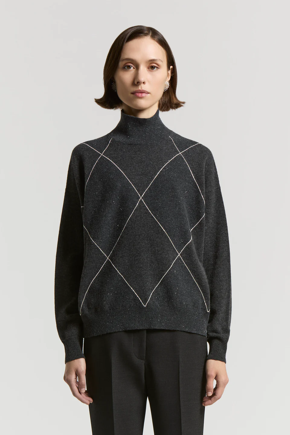 Люрексовая пряжа придаёт этому джемперу элегантность и мерцание в двух оттенках серого, создавая текстуру, которая служит фоном для серебристого дизайна с крупными ромбами.