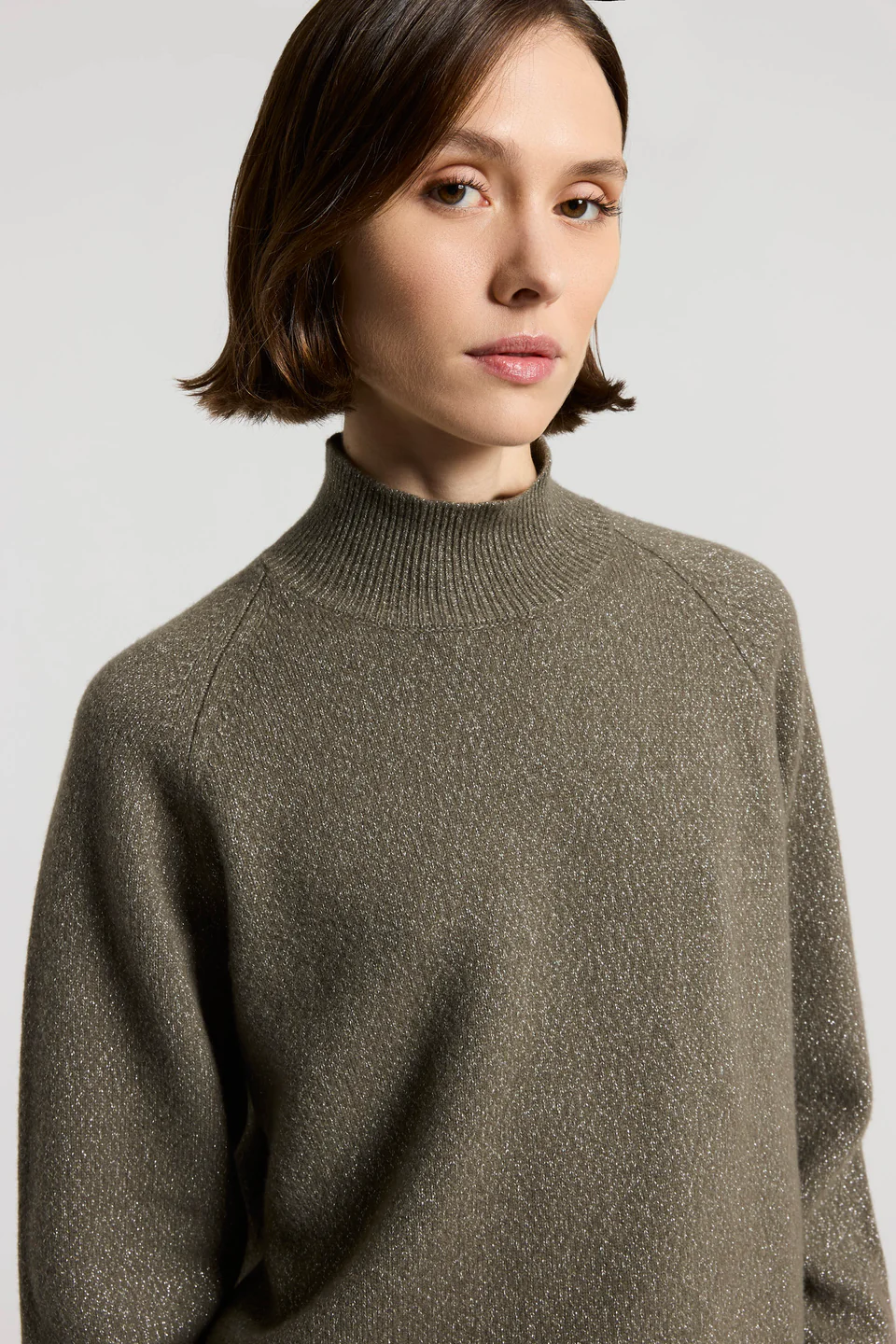Свитер с высоким воротом изготовлен из тонкой мериносовой шерсти и кашемировой пряжи, слегка подсвеченной люрексом.