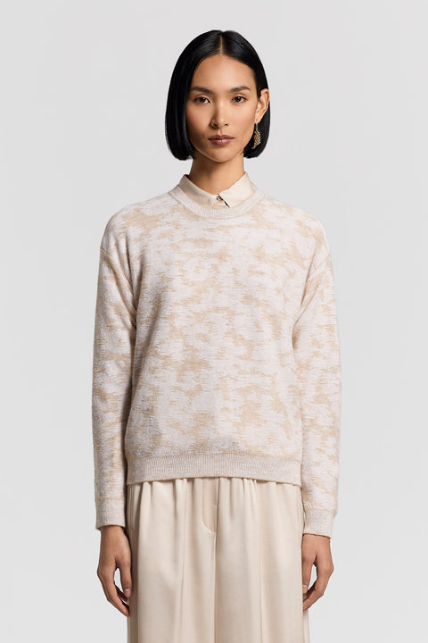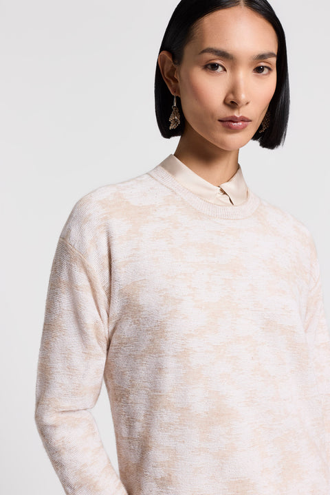 Этот свитер изготовлен из пряжи из шерсти сури и альпаки с добавлением микробисера, придающего ей неповторимое мерцание.