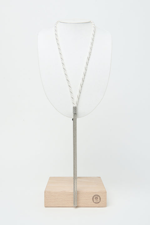 В этом колье мягкость вискозного шнура сочетается с приглушенным блеском цепочки Punto Luce, создавая гармоничный баланс между легкостью и сиянием.