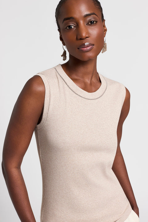 Топ с круглым вырезом идеально сочетается с блейзерами и трикотажными вещами и украшен нашей культовой деталью Punto Luce, которая придает изделию сдержанную и блестящую изюминку, характерную для стиля Peserico.
