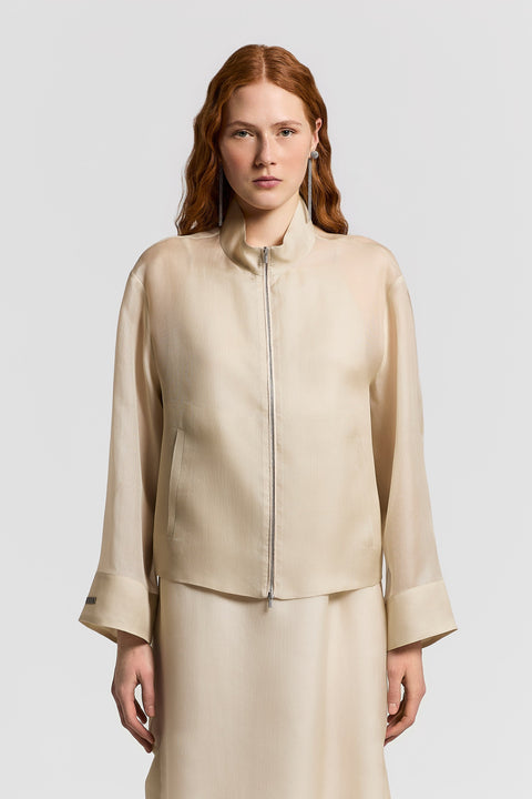 Эта куртка, вдохновленная легкостью и бликами природы, сшита из тонкого шелкового газара, который отражает свет и создает тонкую игру прозрачных оттенков, напоминая о гармонии природных стихий.