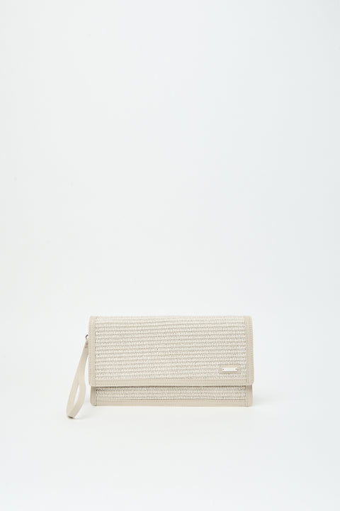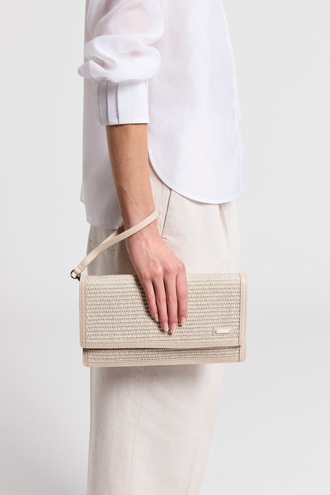 Этот клатч-конверт из смесовой хлопковой ткани напоминает по ощущениям плетеную солому, а отделка из натуральной кожи наппа придает ему изысканный вид.