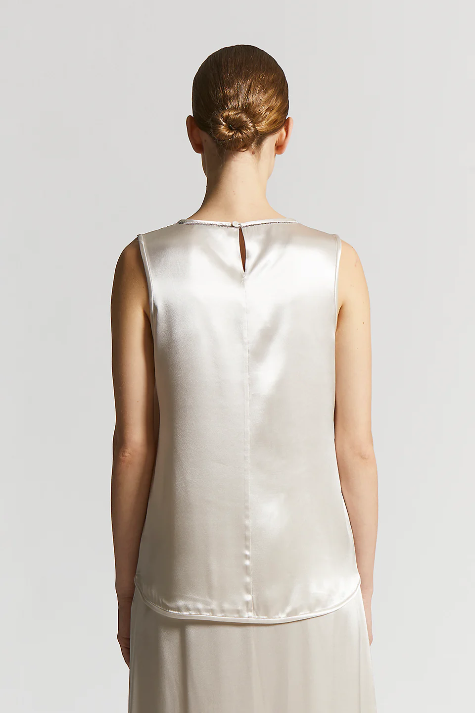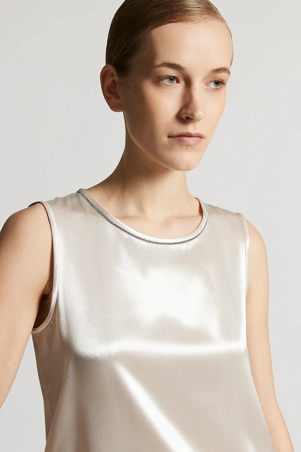 Топ из вискозного атласа без рукавов отличается расклешенным силуэтом и круглым вырезом, который слегка мерцает благодаря детали Punto Luce.