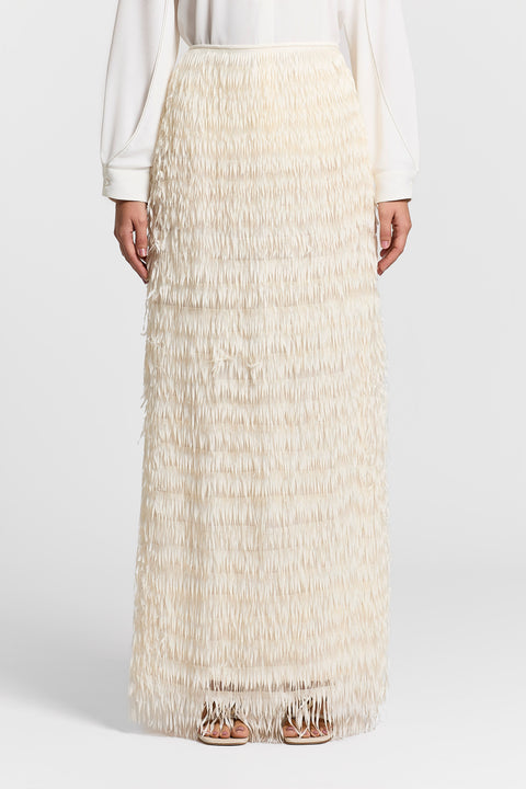 Эта длинная юбка из органзы с бахромой из крепдешина сочетает в себе динамичность и легкость, создавая элегантный силуэт.