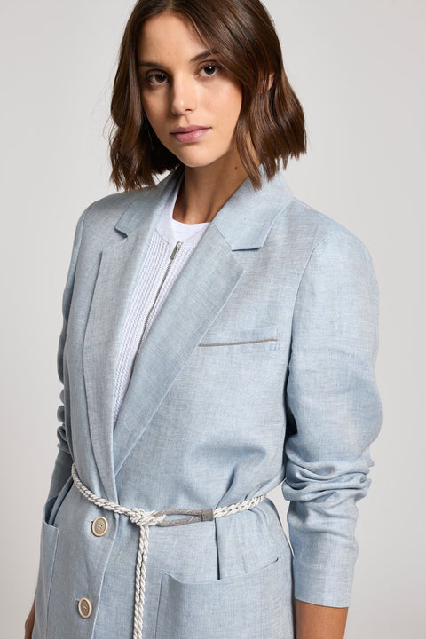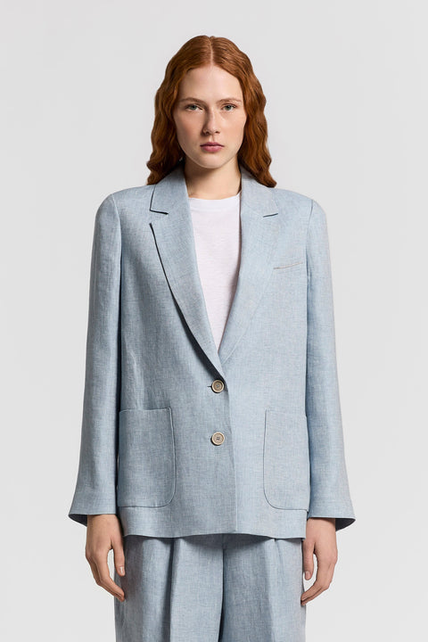 Этот однобортный блейзер сшит из чистого льняного габардина, окрашенного в массе.