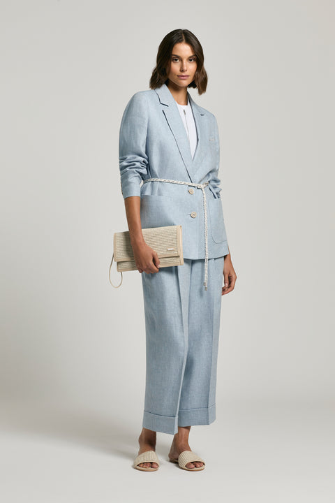 Нежно-голубой блейзер идеально сочетается с льняными брюками или шортами, а также с джинсами, создавая элегантный и свежий образ.