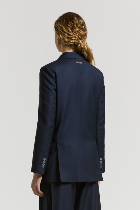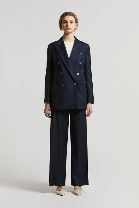 Этот двубортный пиджак сшит из саржи из 100% натуральной шерсти Estrato comfort — культовой ткани в мире портновского искусства.