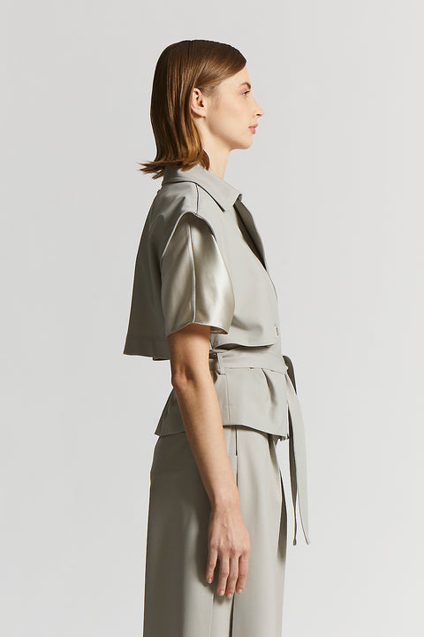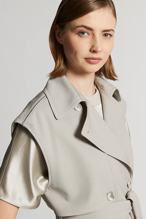 Модель с характером: двубортный жилет в стиле тренча с поясом зеленого оттенка, который напоминает о морозных полях ранним зимним утром.