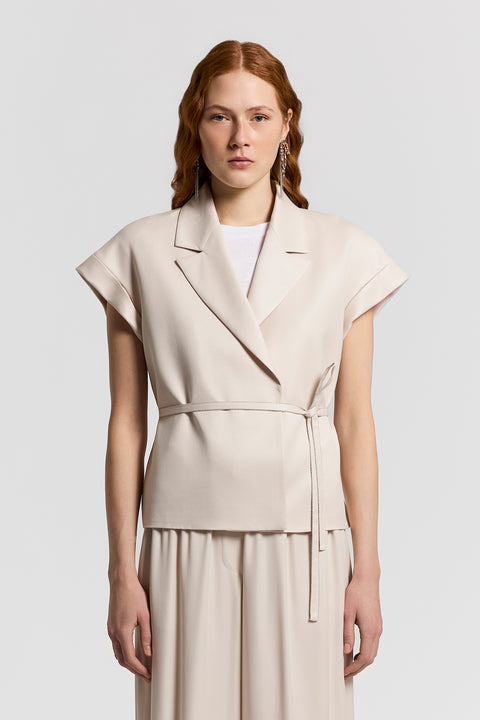 Этот жилет сшит из вискозно-купровой ткани персикового цвета с диагональным переплетением. Эта ткань сочетает в себе элегантность и комфорт благодаря своим натуральным свойствам.